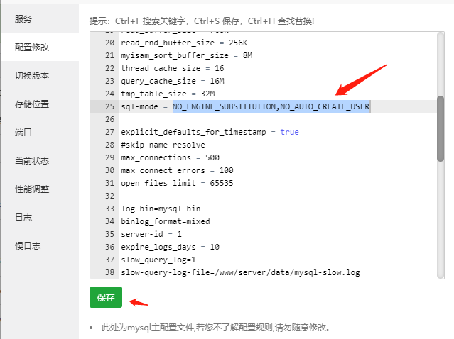 2.點(diǎn)擊配置修改,查找sql-mode或sql_mode (可使用Ctrl+F快捷查找)